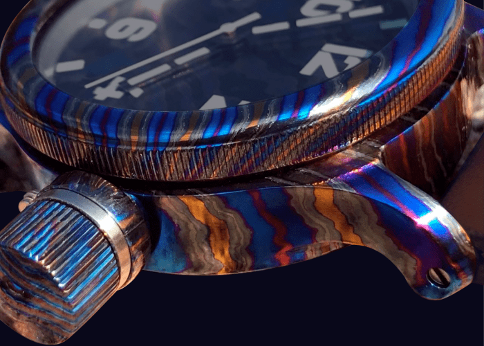 This watch is made of a unique alloy of titanium, zirconium and stainless steel. What is important, metal work is done by hand and according to the traditional Damascus technique, when metal layers are placed on each other, then forged, twisted, heated, and forged again multiple times.