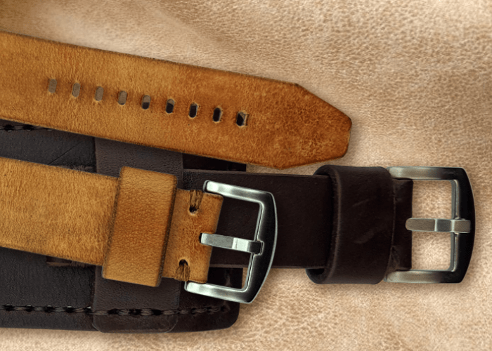 This wide, single-layer strap with a wide wristband is made of thick genuine leather treated with natural waxes without glueing or splicing. Stitching is made with waxed thread, strap and stitching colours can be changed.